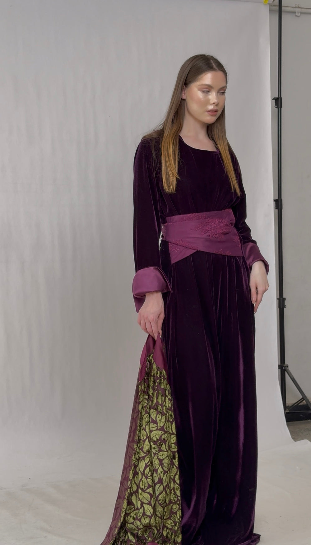 The look is completed with a stunning printed open kimono featuring rich green and plum tones, wide cuffs, and a structured collar for a regal finish.